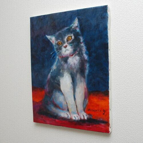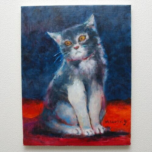 下書き無し、キャンバスにそのままイメージを描き巡らせ完成した作品です。描き始めは、背景にお魚を泳がせていましたが途中で消しました。すこーしうろこっぽく見えるものが背景にあるかもしれません。猫と背景はダークに、下部分に鮮やかな赤系を入れてコントラストをはっきりと仕上げました。